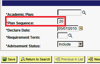 - Adjust the Plan Sequence so that the primary major is 10, the second major is 20, minors and certificates are 30 and pre-professional plans are 40.