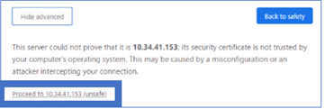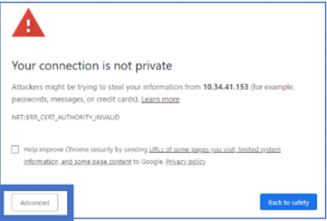 NOTE: If prompted with not private connection, select Advanced and Proceed to IP address