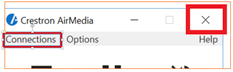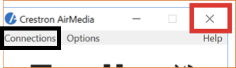 - Exit the system by clicking the X in the upper right hand corner of the Crestron AirMedia window