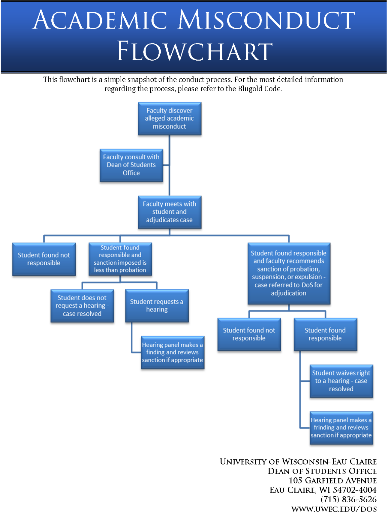 Chapter UWS 14 (Student Academic Disciplinary Procedures) and Chapter UWS 17 (Student Non-academic Disciplinary Procedures) have been incorporated into the UW-Eau Claire Blugold Code either by adapting or inserting verbatim the language of these statutes. Chapter UWS 14 can be found online at: https://docs.legis.wisconsin.gov/Code/admin_Code/uws/14.pdf. Chapter UWS 17 can be found online at: http://docs.legis.wisconsin.gov/Code/admin_Code/uws/17.pdf. In the event of conflict between this Code and either Chapter UWS 14 or Chapter UWS 17, the Chapters will supersede this Code. The Dean of Students Office maintains and updates the Blugold Code. Questions regarding the Code should be directed to the office, located in 240 Schofield Hall, phone (715) 836-5626, fax (715) 836-5911, email deanofstudents@uwec.edu.