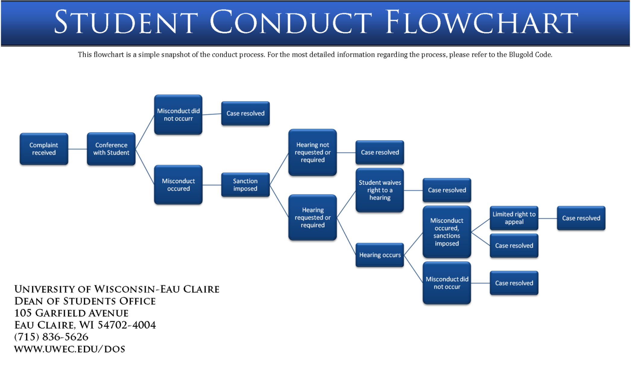 The UW-Eau Claire Blugold Code has been developed to create and maintain a safe, supportive, and inclusive campus community that engages students in order to foster their academic success, personal growth and responsible citizenship. As developing adults, students are capable of making their own decisions and must be prepared to accept the consequences for those decisions. The student conduct process has been established to respond to incidents involving allegations of inappropriate behavior within our community. This process provides educational opportunities which encourage students to evaluate their own actions, consider their own decision making, and acquire new skills to improve their choices in the future.