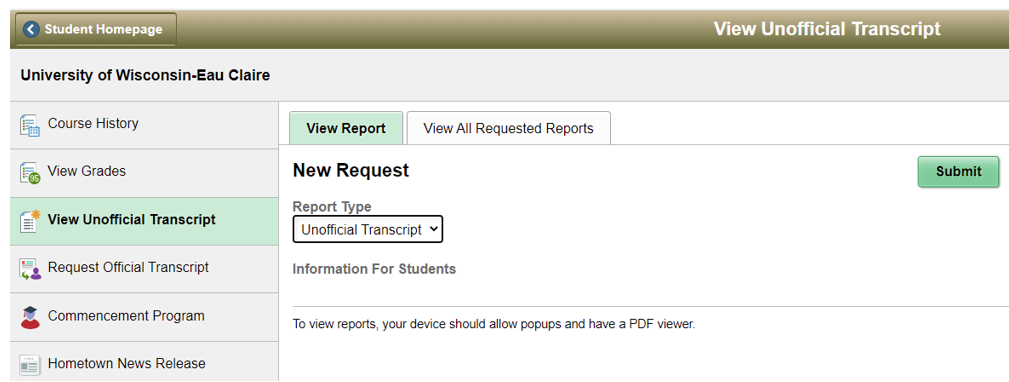 - Select Submit. To view reports, your device should allow popups and have a PDF viewer.
