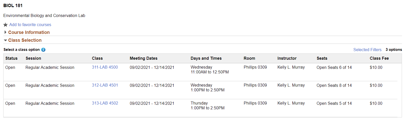 2. Once you've got the results you are looking for you can select the course and the individual course sections will appear. Click on the Class link that contains the section number, course type (component), and the class number and Class Information will appear.