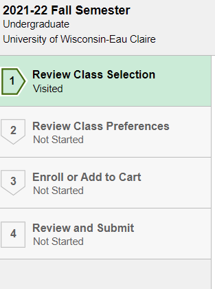 4. If it is within the enrollment period you can select the course and you'll see the following prompts for Steps 1-4. To enroll or place the course in your shopping cart you can find additional steps here, https://kb.uwec.edu/article/planning-and-enrolling-in-classes/.