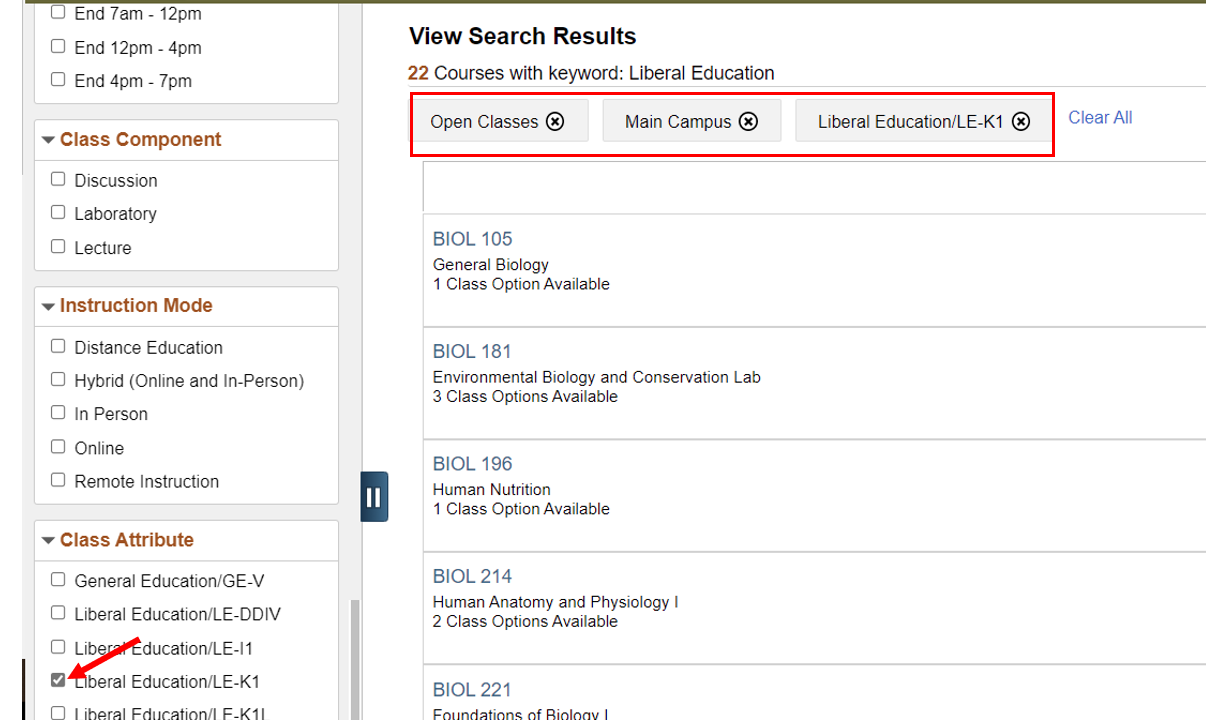 3. You might also choose to search by a keyword that is not a course or department (ex. Liberal Education). If the keyword brings back a lot of options you'll see this message. At this point you'll want to use additional filters to narrow down the search (ex. LE-K1)