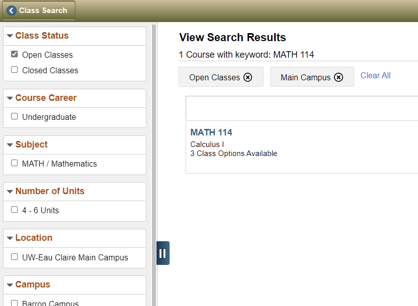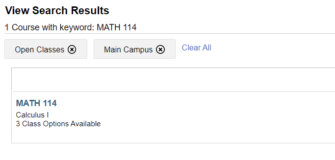 - For each course a single row will appear. Some defaulted filters will be along the top (ex. Open Classes and Main Campus). At this point you can remove those filters to expand the search results.