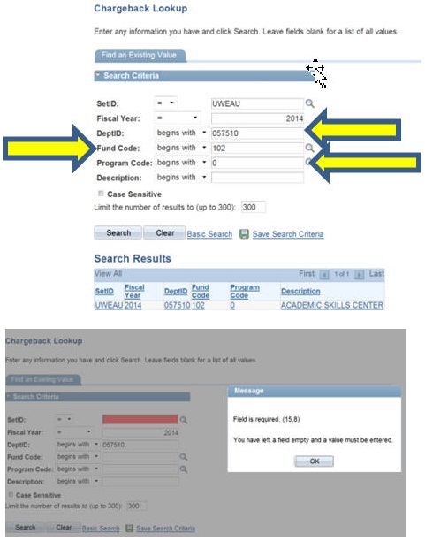 Clear the DeptID, Fund Code, and Program Code fields. NOTE: If you click the Clear button, you will need to include the fiscal year and make sure the SetID field shows UWEAU or you will get an error.